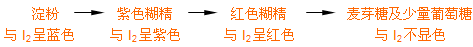在本實驗中,以稀釋的唾液作為淀粉酶液。唾液內的淀粉酶可將淀粉逐步水解成各種不同大小的糊精分子,最終產物為麥芽糖和少量的葡萄糖。它們遇碘呈不同的顏色。直鏈淀粉(即可溶性淀粉)遇碘呈藍色;糊精按分子從大到小的順序,遇碘可呈藍色、紫色、暗褐色和紅色,最小的糊精和麥芽糖遇碘不顯顏色: