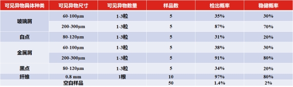 在考核過程中,我們將已知可見異物樣品和空白樣品組成考核樣本組。其中,異物樣品按照風險產生異物種類分為大小兩類,大粒徑不建議大于250微米(大于250微米異物人工燈檢檢出概率接近100%,失去考核意義);小粒徑建議在150-80微米之間(小于80微米檢出概率太低,難以考核)。這些經過嚴格篩選和分級的考核樣品,作為標準物質用于評估燈檢員的檢查能力。