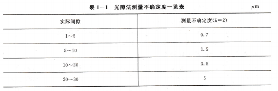 影響光隙法測量準確度的因素除光源的形式、照度和距離以外,與接觸面的斷面形狀、寬度、表面粗糙度以及被測件的顏色、底襯有關。另外,當光隙很小時,由于光的干涉和衍射現象,就會產生彩色條紋,會使光隙大小的估計帶來影響。因此,應根據不同的情況進行判斷。經驗對測量結果的影響也很重要。需要不斷地實踐,總結經驗。經大量的試驗,光隙法測量的不確定度如表1 — 1所示。