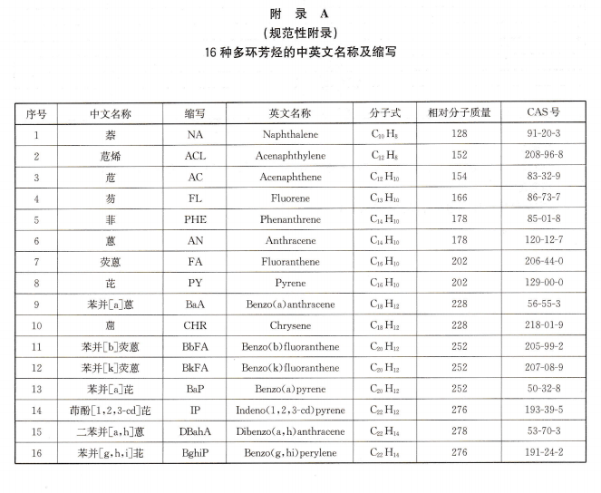本標準適用于水產(chǎn)品及水產(chǎn)加工品中萘、苊烯、苊、芴、菲、蒽、熒蒽、芘、苯并[a]蒽、?、苯并[b]熒蒽、 苯并[k]熒蒽、苯并[a]芘、茚酚[1,2,3-cd]芘、二苯并[a,h]蒽、苯并[g,h,i]苝共16種多環(huán)芳烴的測定。 16種多環(huán)芳烴的中英文名稱及縮寫見附錄A。