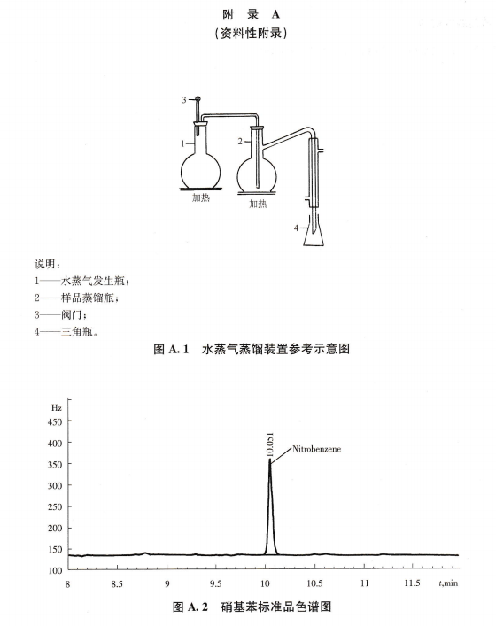 將樣品解凍,稱取樣品10 g(精確至0. 01 g),置于50 mL離心管中,加入丙酮(4. 1)25 mL,勻質1 min,分散均勻,提取硝基苯,4 000 r/min離心5 min,收集上清液。再向離心管中加丙酮(4. 1)20 mL,用原勻質機再勻漿1 min,4 000 r/min離心5 min,合并丙酮提取液于500 mL蒸餾瓶中,水蒸氣蒸餾出250 mL;餾出液置于500 mL分液漏斗中,加入氯化鈉(4. 4)20 g,加入苯(4. 2)10 mL,劇烈振搖萃取3 min?5 min,靜止30 min分層,棄去下層水相,加入2%氯化鈉溶液(4. 6)20 mL,洗滌苯萃取液,靜止分層,棄去下層水相,取苯層2 mL?3 mL置于預先裝有少許無水硫酸鈉(4. 3)的5 mL具塞離心管中,脫水,備色譜分析用。
