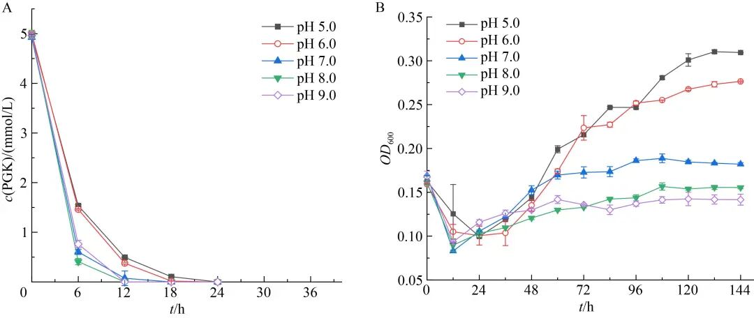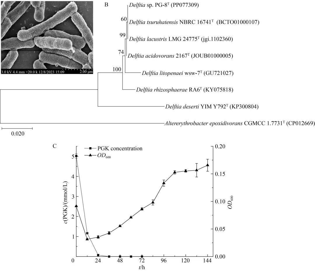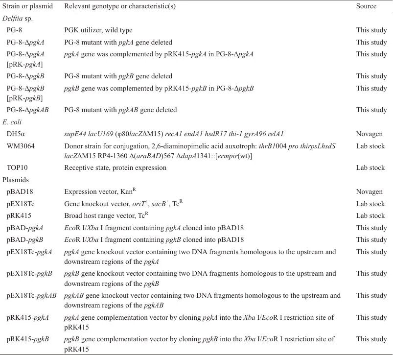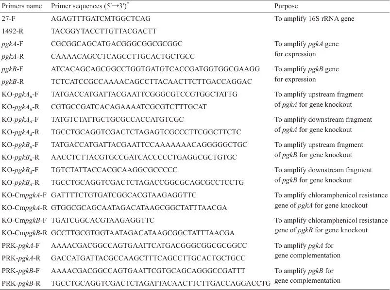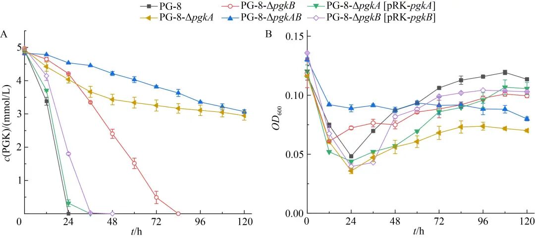 結(jié)論P(yáng)G-8是代爾夫特菌屬中第一株能夠利用PGK作為唯一碳源生長(zhǎng)的菌株,pgkA和pgkB在PG-8利用PGK作為唯一碳源生長(zhǎng)過(guò)程中均具有重要的生理功能,但pgkA起主導(dǎo)作用。