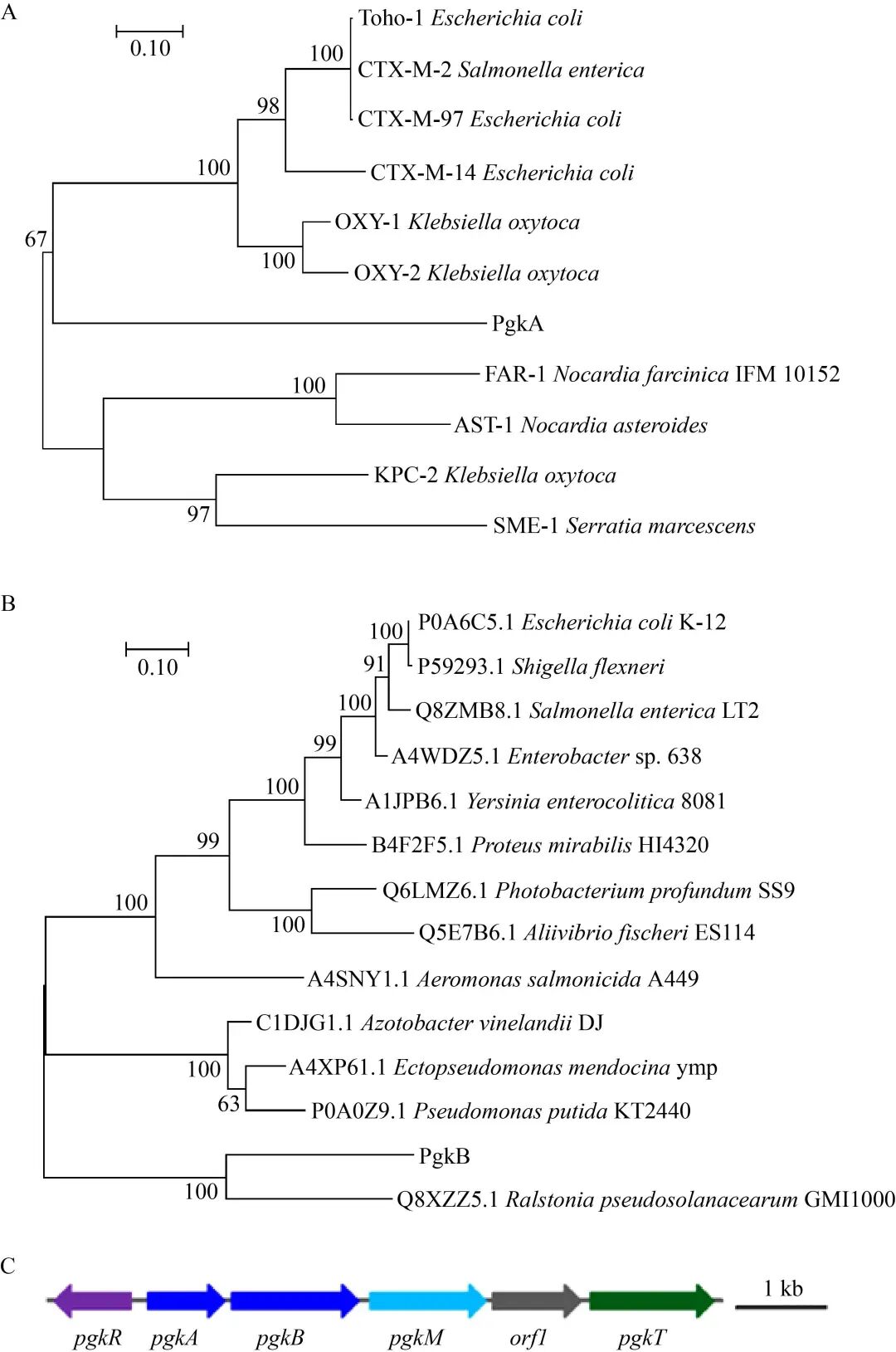 結(jié)果獲得的代爾夫特菌屬(Delftia sp.) PG-8能夠降解并利用PGK作為唯一碳源生長(zhǎng),且在pH 7.0、溫度35 ℃、底物濃度為10.00 mmol/L時(shí)表現(xiàn)出最佳的底物降解效果和細(xì)菌生長(zhǎng)狀況。PgkA能夠催化PGK快速降解[Km=(99.19±19.45) μmol/L,kcat/Km=(1.96±0.55)×105 L/(mol·s)],并且與已完成功能鑒定的β-內(nèi)酰胺酶相比PgkA具有獨(dú)特的進(jìn)化起源。PgkB也能夠催化PGK降解,但其對(duì)底物的親和力僅為PgkA的1/5,且底物催化效率也較低。菌株P(guān)G-8-ΔpgkA和PG-8-ΔpgkB降解和利用PGK生長(zhǎng)的能力均顯著下降,且PG-8-ΔpgkA能力下降更為明顯。雖然同時(shí)敲除pgkA和pgkB的PG-8-ΔpgkAB仍能降解一定量的底物,但無(wú)法利用PGK作為唯一碳源生長(zhǎng)。