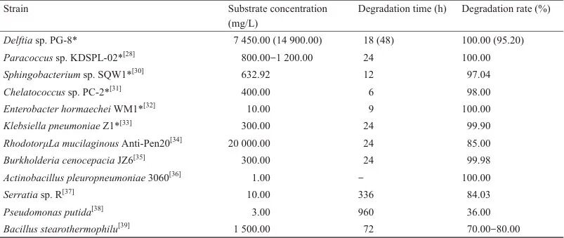 *: Strains capable of utilizing penicillin G as the sole carbon source; -: The degradation time is unknown.