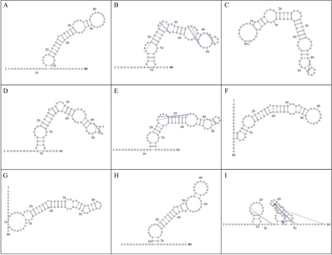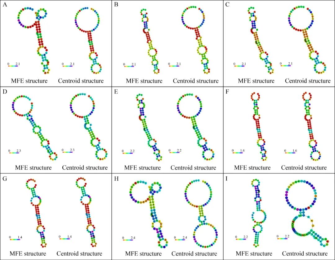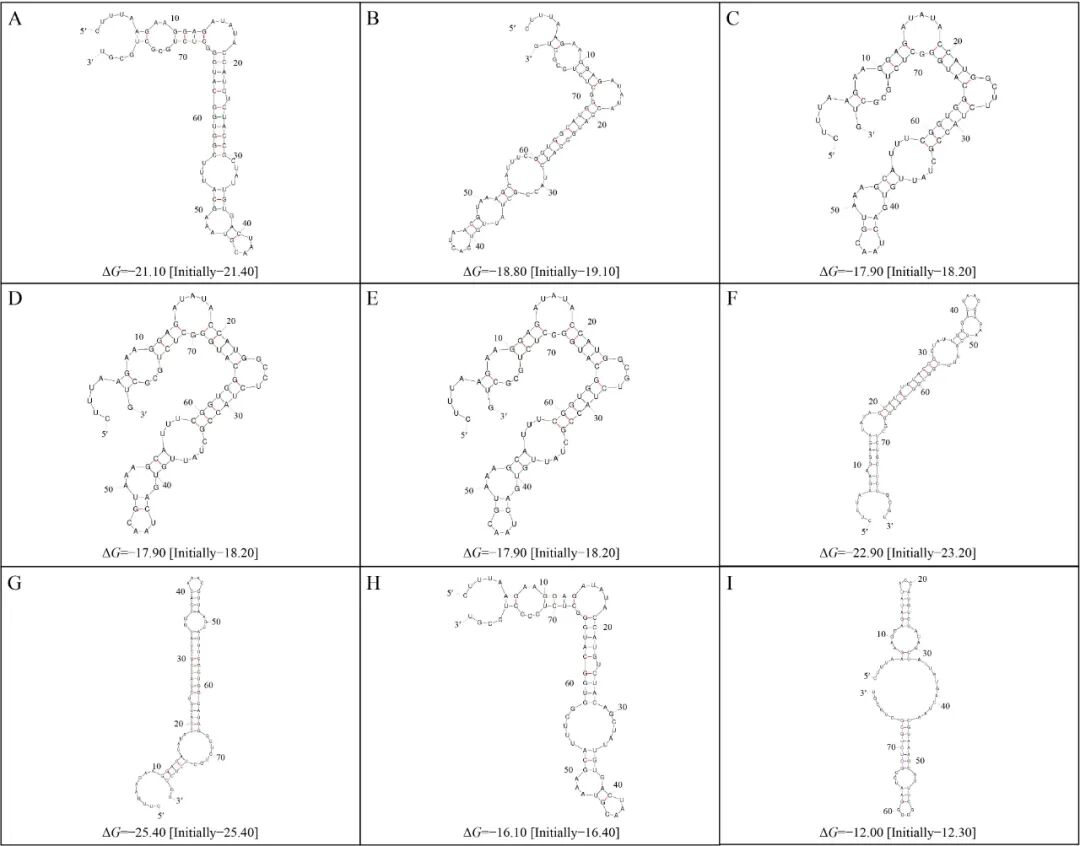 a:下劃線代表起始密碼;b:源于ViennaRNA;c:源于Mfold。