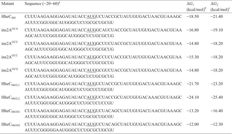a: The underline represents the start codon; b: Calculated by ViennaRNA; c: Calculated by Mfold.