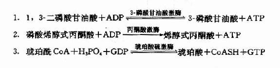 (一)底物水平磷酸化(substrate level phosphorylation) 底物分子中的能量直接以高能鍵形式轉移給ADP生成ATP,這個過程稱為底物水平磷酸化,這一磷酸化過程在胞漿和線粒體中進行,包括有: